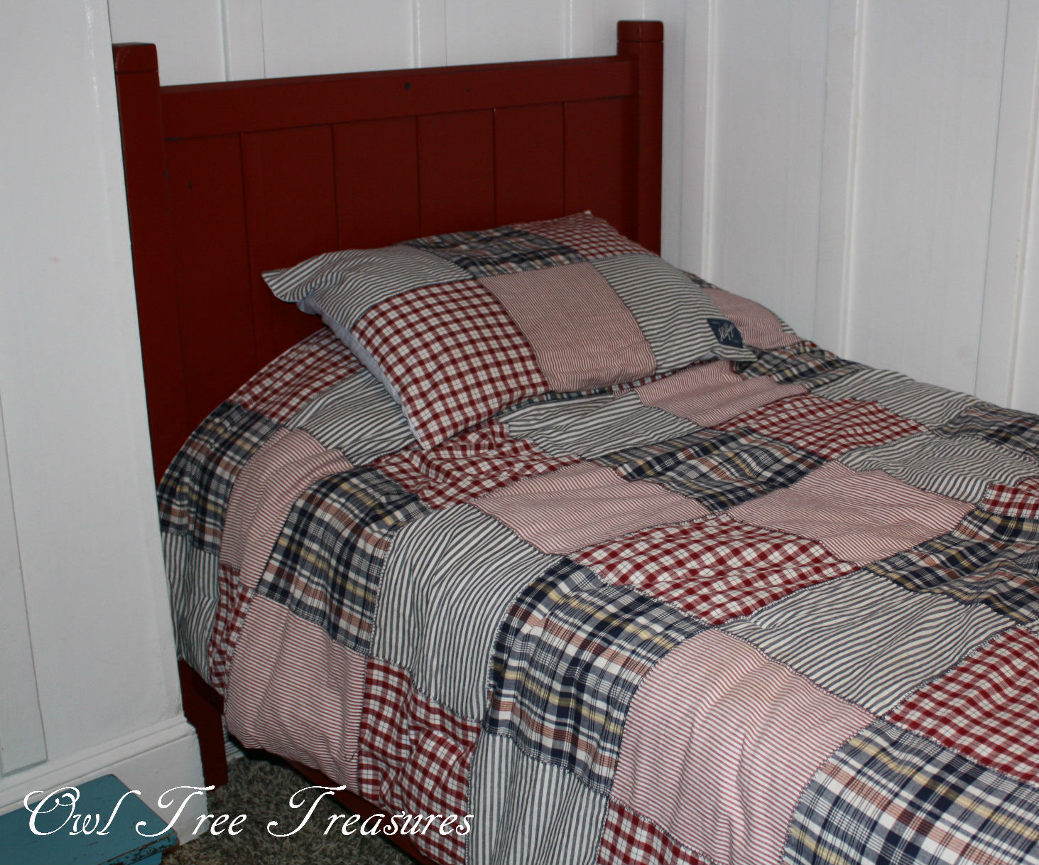 This is a pottery barn bed I bought off KSL for Kyler to put in his room when we moved his crib out of his room. It was a navy blue color when I bought it but had some scratches and marks in it. I first touched all those up because I was going to keep the bed navy blue, however... my love for paint kicked in plus the navy blue didn't give the room the look I wanted with his walls being a lighter blue. So over top of the blue I used my paint sprayer and painted a good deep red color that matched the red in his bedspread...which btw I picked up his bedbread at Ross for $40! Love that place! I then started chippy and distressing the red to show the blue through, Tip for getting the "CHIPPY LOOK"...I use a sanding pad and paint scrapper but I do it just before the paint is all the way dry!